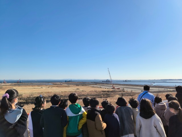 2月25日、雲一つ無い快晴の中、社会科見学に行ってまいりました。最初の見学先は、芝浦にある港区みなとリサイクル清掃事務所。クレーンがゴミを持ち上げ、移動して我々の目の前で止まった際には、思わず大きな声を上げてしまいました。昼を食べた潮風公園では、こんなに広い芝生広場がほぼ貸し切り状態でした。最後に訪れた中央防波堤では、先程見た清掃事務所で灰となったものが運ばれてきており、目の前で埋め立て地が作られている様子に圧倒されました。数十年後に完全な陸地となるであろう場所に向かって、みんなで大きな声で宣言しました。「ゴミ、減らすぞ!」と。