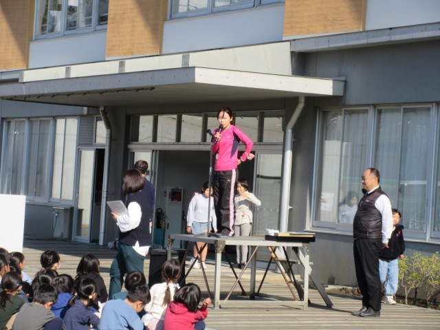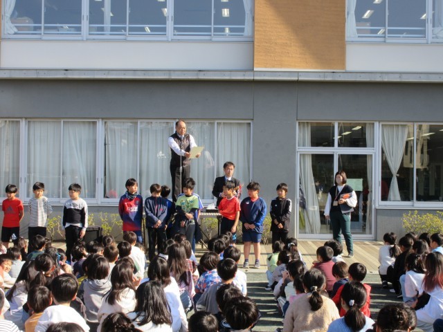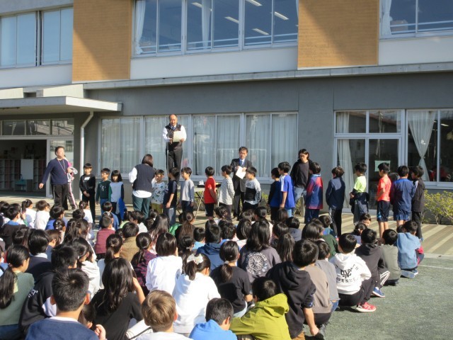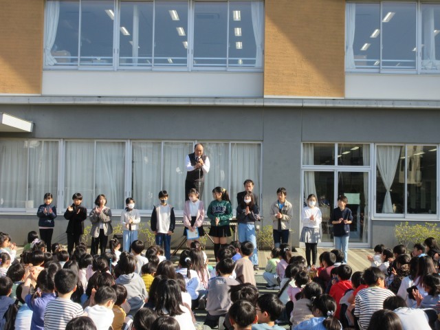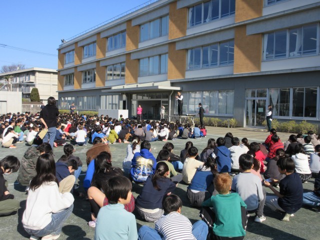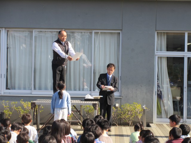 3月17日、数か月ぶりに全校朝会を校庭で行いました。サッカークラブ・東京都公立学校書写展、前期運営委員会によるユニセフ募金の感謝状などの表彰がありました。子供たちは水たまりが残る校庭で校長先生の話や看護当番の先生の話をしっかり聞くことができました。