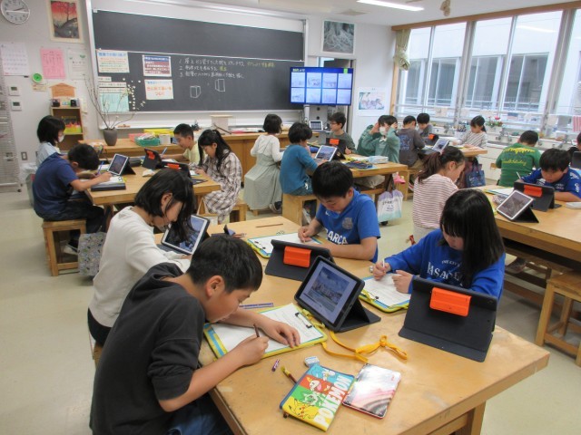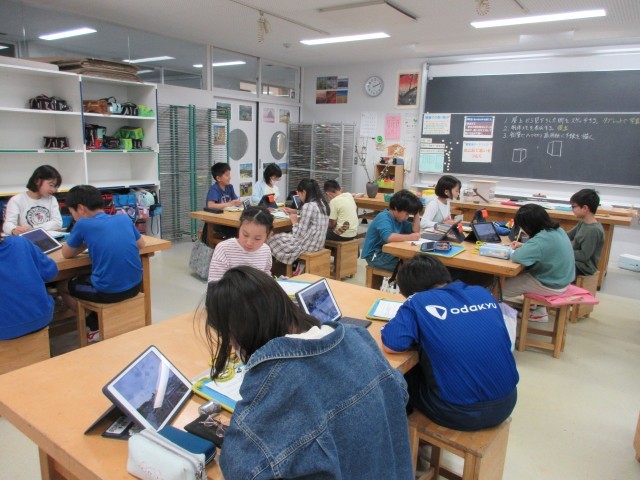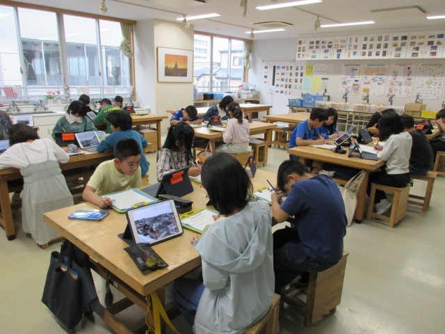 令和7年度は秋に開催予定の展覧会に向けて、子どもたちが図工授業で作品を制作している様子を学校ホームページで紹介します。5年2組の授業は強風のため、図工室へ戻り、タブレット端末で撮影した写真を見ながら描きました。
