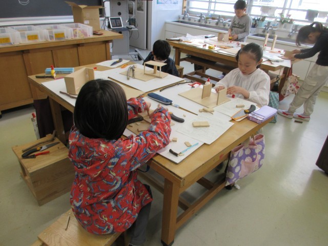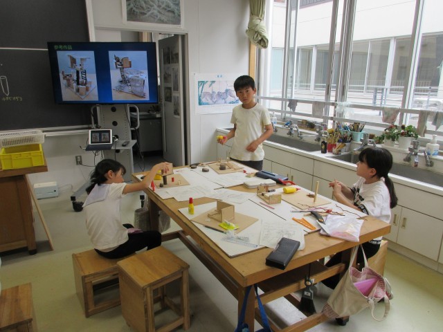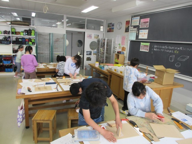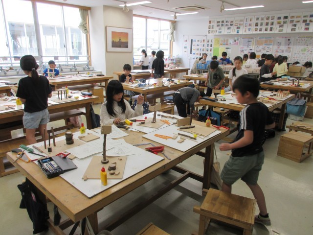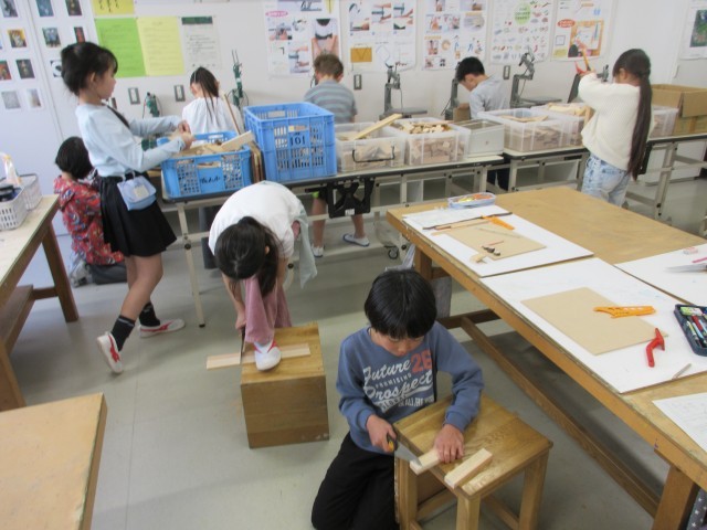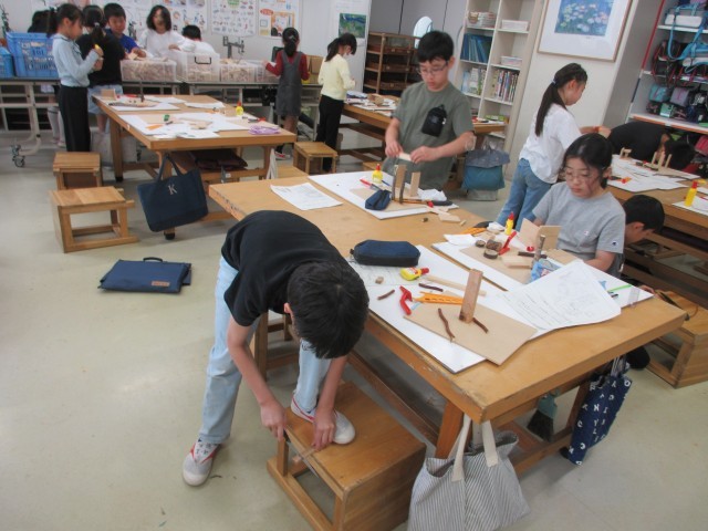 2学期に開催予定の展覧会に向けて、各学年の子どもたちが図工授業で作品を制作している様子を学校ホームページで掲載していきます。今回は4年生が工作の題材「秘密のすみか」に取り組んでいる様子を紹介します。子どもたちは自然木や木片を選んで加工して接着しながら自分だけがゆったり過ごす隠れ家をイメージして作っています。どんな作品になるか楽しみです。