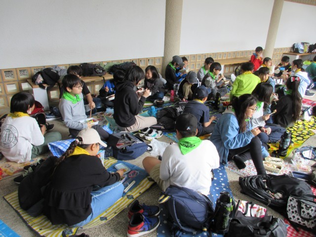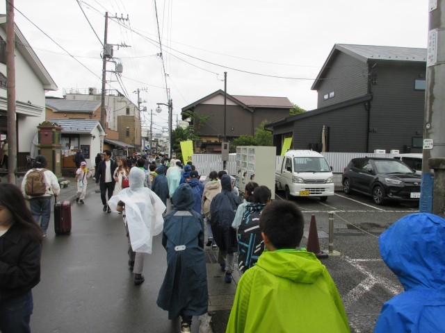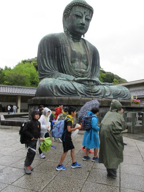 長谷寺をあとにして高徳院まで一般道を歩きました。保護者の方に作っていただいたお弁当を美味しくいただき、写真屋さんに集合写真を撮影してもらいました。鎌倉の大仏を見学してから鶴岡八幡宮まで班行動で雨の降りしきる中をハイキングに出発しました。