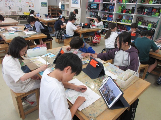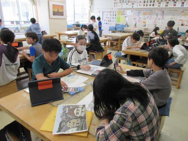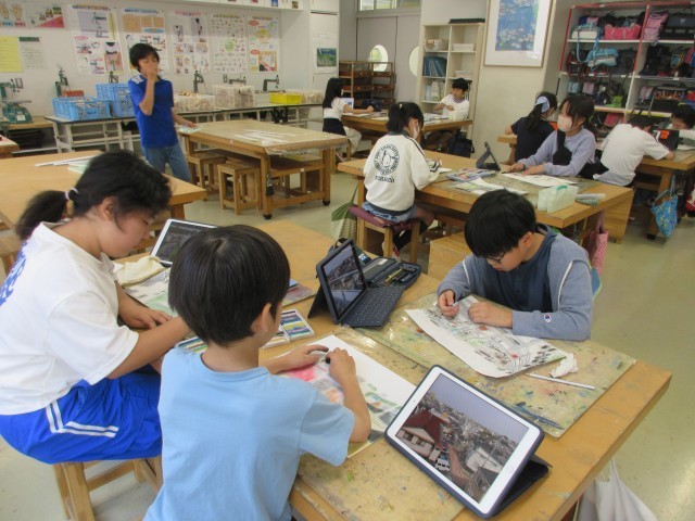 秋に開催予定の展覧会に向けて、子どもたちが図工授業で作品制作している様子を学校ホームページで紹介します。5年生の授業では屋上から見下ろした自分の住む町を絵で表す題材「私の住む町を描こう」に取り組んでいます。(最初の授業で撮影した写真を参考にしています。)パステルによる色彩表現や竹ペンを使った線描など新しい表現方法に挑戦してしています。