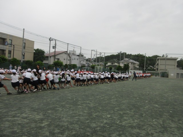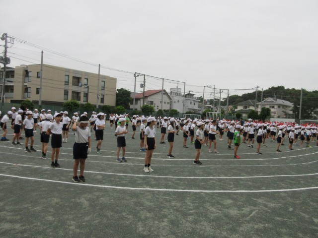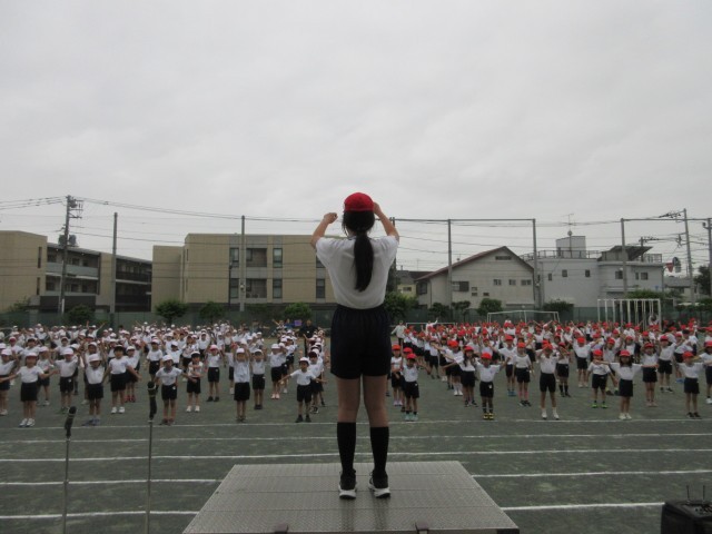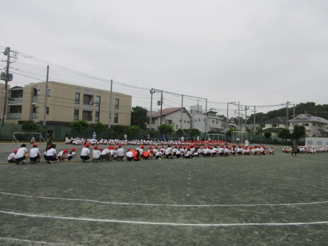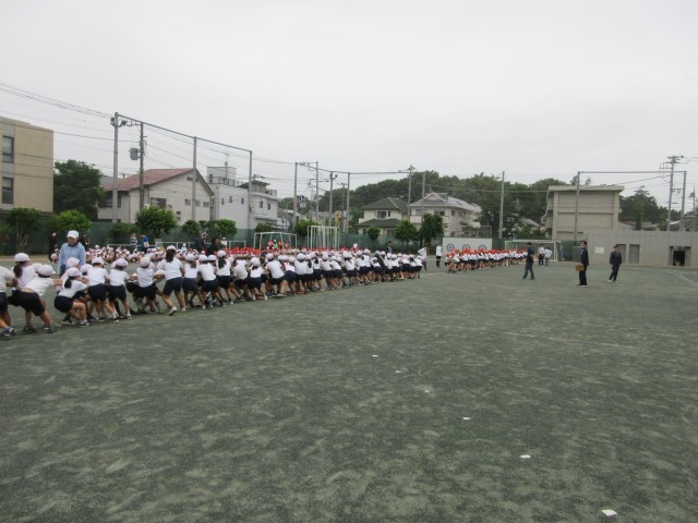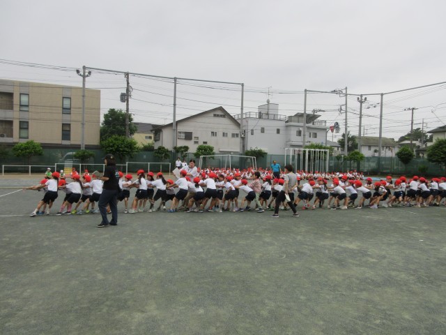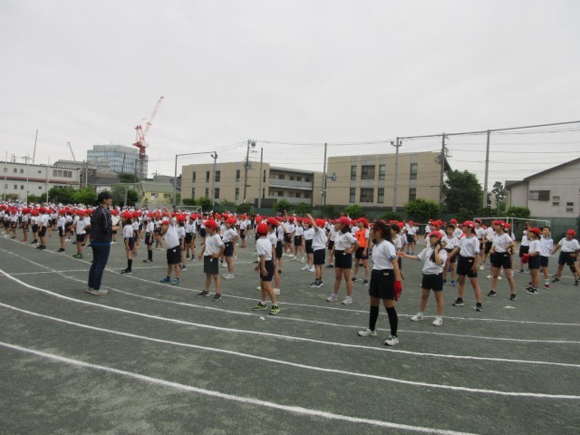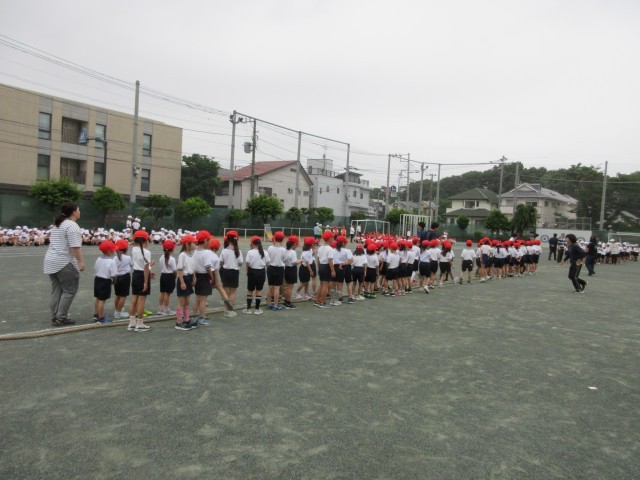 5月19日、1回目の運動会全校練習を行いました。開会式、準備運動、全校競技(2学年ずつ行う綱引き)の流れを練習しました。天候が悪い中でしたが、子どもたちは集中して取り組むことができました。