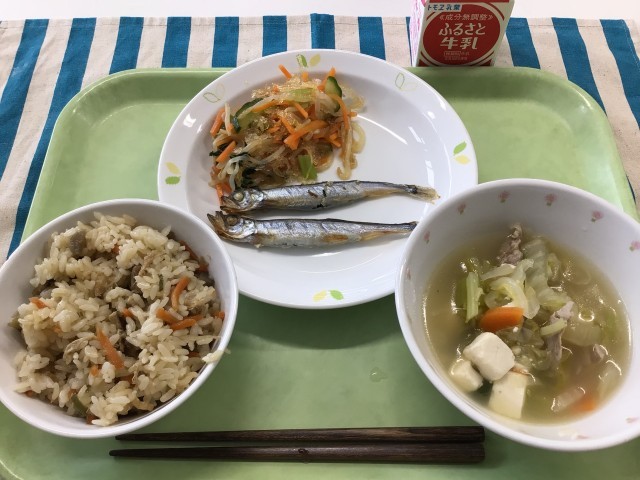 深川めし 牛乳 焼きししゃも 豆腐汁 糸寒天と野菜のあえもの