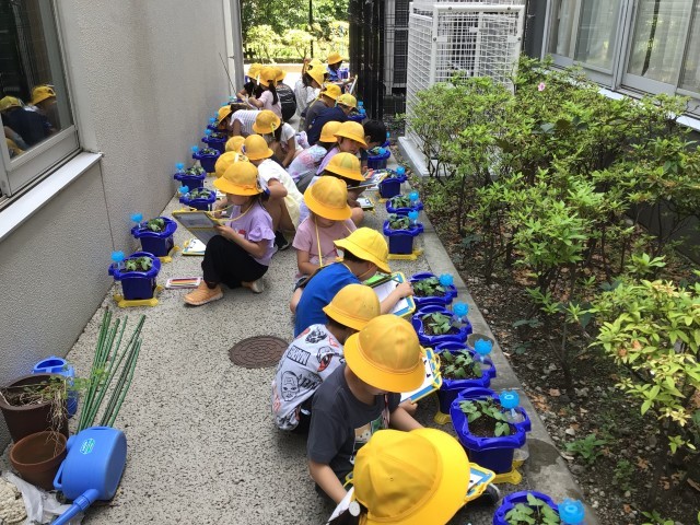運動会の練習を毎日頑張っている1年生。朝顔の水やりも毎日頑張っています。心を込めてお世話をしているので、みんなちゃんと芽が出てきました!観察をしながら、「形が面白い!」「つるつるしているよ!」「茎は、赤紫色だ!」などいろいろな発見をしていました。これからの成長も楽しみです!
