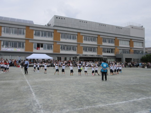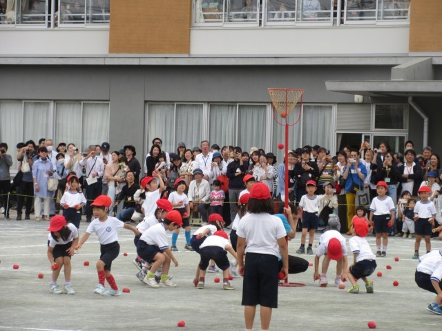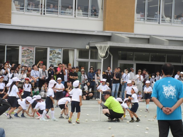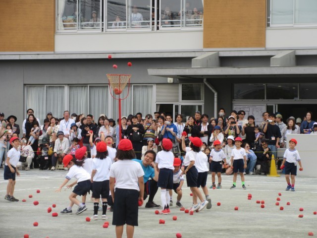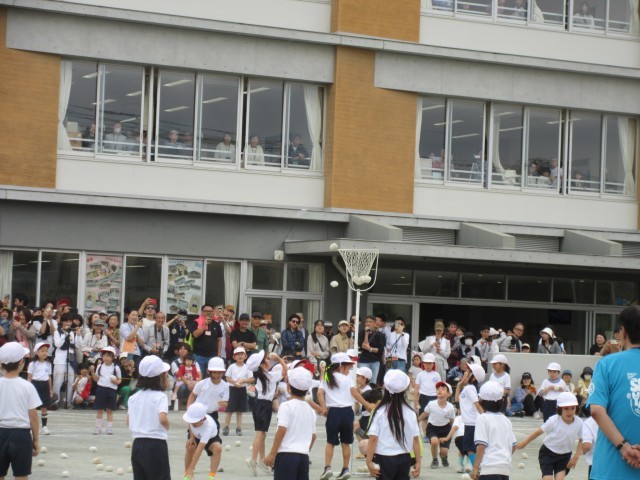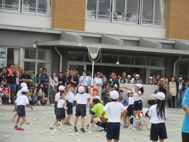 1年生の学年競技は「Dancing☆玉入れ」、子どもたちはチェッコリという曲に合わせて踊りながら網の中に玉を入れて競い合いました。
