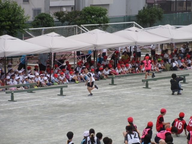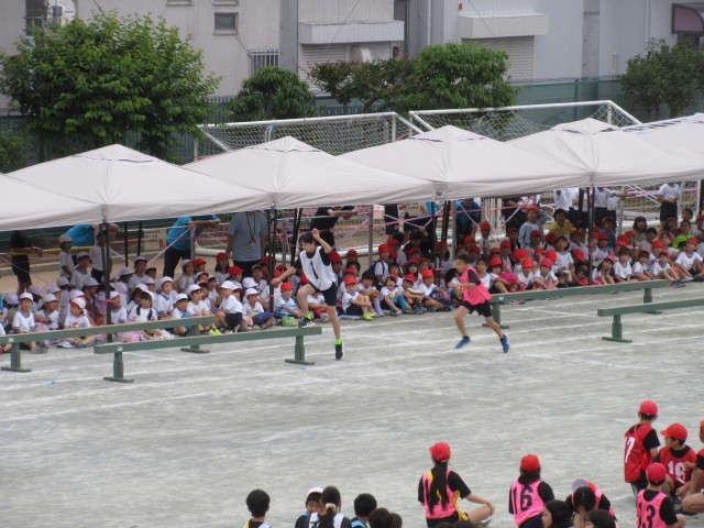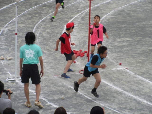 3つの壁をどれだけ速く突破して仲間に繋げるかを競い合いました。足の速さだけで勝敗が決まるこ
