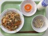 献立 あんかけ焼きそば ジャンボ豆腐シューマイ みかん1/2 牛乳 にんにく、...