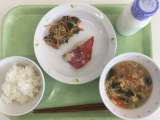 献立 ごま揚げパン まめのミネストローネ くきわかめのサラダ 牛乳 ベーコン(...