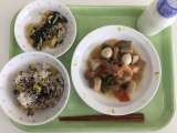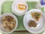 献立 子ぎつねごはん 凍み豆腐のそぼろあんかけ 白菜のおかか和え くだもの 牛乳...
