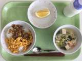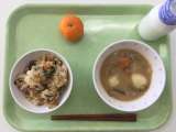 献立 大豆とごぼうのそぼろごはん 飛鳥汁 くだもの 牛乳 米(山形) ぶた肉(...