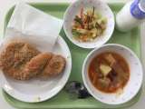 献立 ごはん ムロアジのメンチカツ 一塩野菜 みそ汁 牛乳 米(山形) 卵(千...