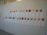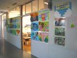 2年生の教室前の廊下壁面に子供たちが制作した図工作品を展示しています。題材名は「...