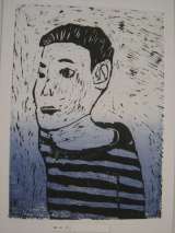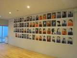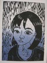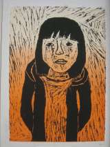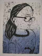 1階ギャラリーに4年生が図工授業で制作した題材名「身近な人物を木版画で表そう」の...