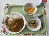 献立 カレーライス 福神漬け こんにゃくサラダ ネーブルオレンジ 牛乳 米(山...