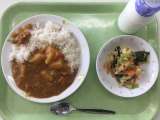 献立 カレーライス かみかみわかめサラダ 福神漬け 牛乳 米(秋田) 豚肉(埼...