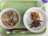 献立 鶏飯(けいはん) きびなごのごま揚げ 白菜のおかか和え 牛乳 米(秋田)...