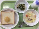 献立 食パン りんごジャム マカロニのホワイトソース ごまサラダ 牛乳 りんご...