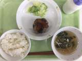 献立 ご飯 秋茄子バーグ 一塩野菜 月見汁 牛乳 米(秋田) かぼちゃ、玉ねぎ...