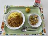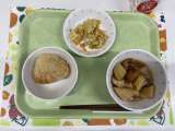 献立 豆カレー 青のりポテト みかん 牛乳 米(山形) みかん(愛媛) 鶏肉(...
