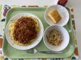 献立 秋のミートソーススパゲティ もやしサラダ ぐりとぐらのかすてら 牛乳 ☆ぐ...