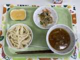 献立 里山うどん こんにゃくサラダ 浮島 牛乳 卵(群馬) にんじん、玉ねぎ(...