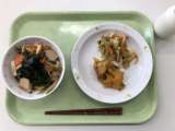 献立 わかめうどん しいらのもみじあげ 野菜のポン酢あえ 牛乳 油あげ(大豆:...