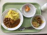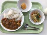 献立 大根カレー 寒天サラダ 柿 牛乳 米(山形) 豚肉(群馬) にんにく(青...