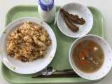 献立 キムチチャーハン サムゲタン風スープ にぎすのヤンニョム揚げ 牛乳 鶏肉...