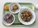 献立 黒米ごはん 筑前煮 みそドレサラダ みかん 牛乳 米(山形) しょうが(...