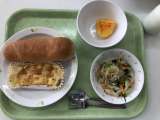 献立 食パン リンゴジャム コーンポタージュ もやしサラダ 牛乳 玉ねぎ、にん...