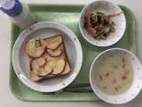 献立 りんごトースト じゃが芋のポタージュ こんにゃくサラダ 牛乳 こまつな(...