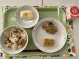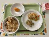献立 吹き寄せごはん ツナの卵焼き ごま酢和え りんご 牛乳 米(山形) 鶏肉...