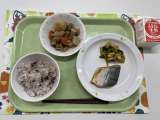 献立 黒米ごはん 魚のみそ照り焼き 野菜のおかか和え 筑前煮 牛乳 米(山形)...
