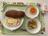 献立 ココアフレンチトースト じゃが芋のポタージュ コーンサラダ 牛乳 卵(群...