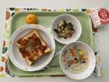 献立 ピザトースト さつま芋と小松菜のシチュー かむかむわかめサラダ 牛乳 鶏...