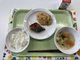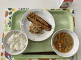 献立 ごはん サバのピリ辛焼き 切干大根の煮物 白菜のスープ 牛乳 米(山形)...