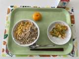献立 めだいのそぼろご飯 にんじんサラダ みかん 牛乳 米(山形) 卵(群馬)...