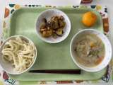 献立 ちゃんぽんうどん 豆入り大学芋 みかん 牛乳 豚肉(茨城) さつま芋(千...