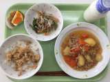 献立 ご飯 おからそぼろ 肉じゃが 茎わかめのナムル みかん 牛乳 豚肉(栃木...