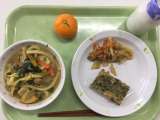 献立 カレーうどん にらとじゃこのチヂミ 白菜のおかか和え みかん 牛乳 豚肉...