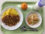献立 ダールカレー じゃが芋のハニーサラダ みかん 牛乳 米(山形) みかん(...