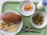 献立 米粉パン さつま芋ときのこのグラタン 寒天サラダ 夢オレンジ 牛乳 鶏肉...