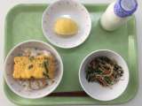 献立 親子丼 野菜のごま酢和え りんご 牛乳 米(山形) にんじん(千葉) 玉...
