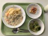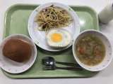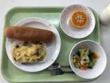献立 米粉パン 目玉ココット スパゲティソテー 角切り野菜スープ 牛乳 えのき...