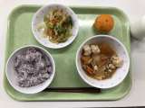 献立 ゆかりご飯 肉豆腐 寒天サラダ みかん 牛乳 にんじん(千葉) 玉ねぎ(...
