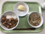 献立 しいらの揚げ煮丼 もずくのかきたま汁 りんご 牛乳 米(山形) 卵(群馬...