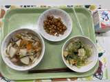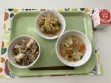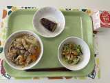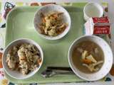 献立 とりめし だんご汁 油揚げのサラダ 牛乳 米(山形) 小松菜(江戸川) ...