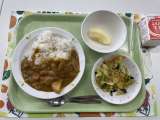 献立 冬野菜のカレーライス 寒天サラダ りんご 牛乳 米(山形) にんにく(青...