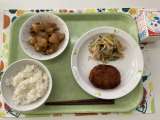 献立 加薬ごはん わかさぎのカレーフリッター 野菜のポン酢和え りんご 牛乳 ...